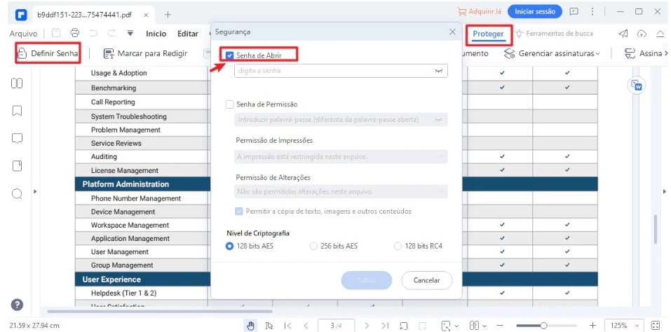 O PDFelement oferece uma série de recursos de segurança para proteger documentos PDF sensíveis. Com a opção de criar PDFs protegidos por senha, você pode garantir que apenas pessoas autorizadas tenham acesso ao conteúdo do arquivo. Além disso, o software permite aplicar restrições de permissões, como impedir a impressão, cópia ou edição do documento, reforçando ainda mais a segurança dos dados.